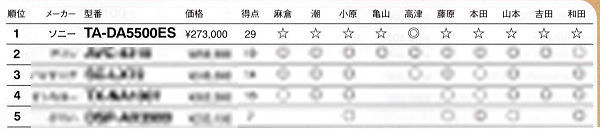 ご覧のとおり、順位は堂々の一位。二位に10点の差がついていますが、これは昨年のTA-DA5400ESと次点モデルとの点差(8点)より大きく、圧勝と言っていいでしょう。高津さんをのぞき全員☆。高津さんが☆をどのモデルにもつけなかったので満点の☆は逃しましたが (惜しい(^_^;)) 、まあ実質満点でしょう。