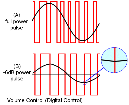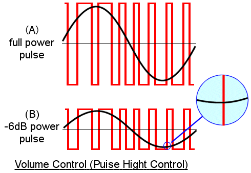 パルスハイトボリウムは、パルスの構成は音質のよいフルボリウムの状態のままで、アナログ的な手段でパルスの高さを変えることで音量をコントロールします。したがって音質は劣化しません。