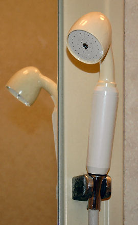 これがかないまる邸の浴室におさまったイオナックの画像です。今まで使っていたヘッドと交換。ネジ部のアダプターが3種類入っていましたが、アダプター無しでそのまま交換できました。