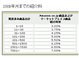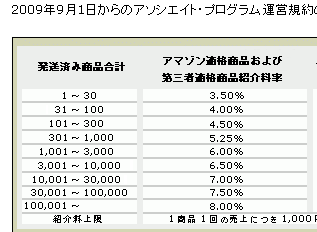 アマゾンでアフェリエイト契約してある場合、商品を販売すると若干の報酬 (紹介料) が入ります。で、下記が8月末までの紹介料です。下限3%から始まり、7001個以上売ると最高の7%になります。どういう人が月に7001個以上売るのか知りませんが…。