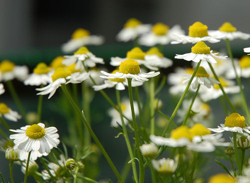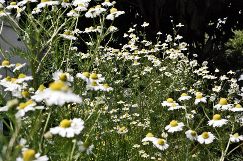 このカモミールは、去年の冬前にこぼれ種から雑草のように生えていたのを、苗として小さな鉢にすくい取り越冬させたものです。3月ごろから花がつき始めましたが、カモミールというのは越冬して、そのあと根でいっぱいになると猛然と花をつける習性があるようですね 。ちなみに撮影は5月です。