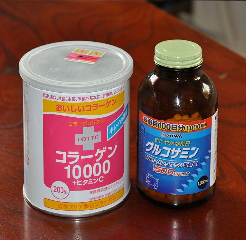 そこでまたまたダイエーに走り、一セット買ってきました。グルコサミンはコンドロイチン入りのものを選んだので、これで上記三要素が採れます。コラーゲンはこの缶詰めと安かったので買いましたが、中身はヒアルロン酸入りのものと半々に混ぜてあります。ヒアルロン酸は指先がカサカサするのがとれて、キーボードを打ち続けても痛くならなくてとてもいいですね。肌はお綺麗に、なったかな(苦笑)。