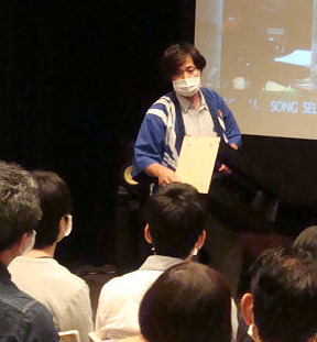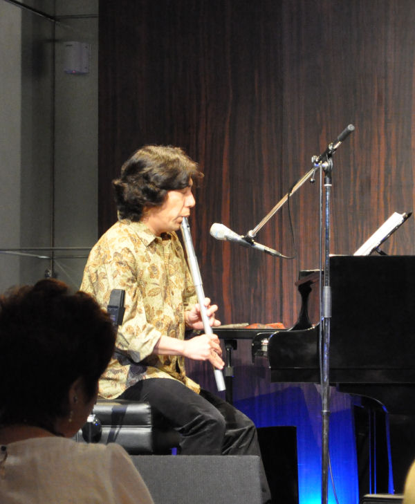 出演は、恵美さんのほか、ギターの小松さん、ピアノ(+アコーデオン+笛)の宇戸さん。恵美さんは通常ライブと、心のバリアフリーコンサートという二つを演奏活動を柱にしていますが、通常ライブの最少の構成がこのトリオ構成で、とても息のあった演奏が次々に披露されました。