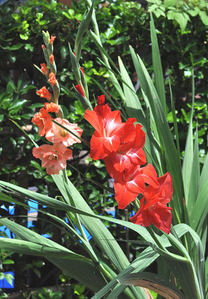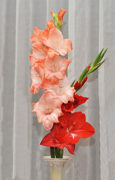 かわいそうなので切り花にして花瓶へ。グラジオラスは切り花にも向く花なので、花自体は花瓶で立派に咲いています。でもかないまる邸では、庭の花は切り花にしないで、そのまま育てて花を終わらせる習慣なので、今回は緊急非難です。