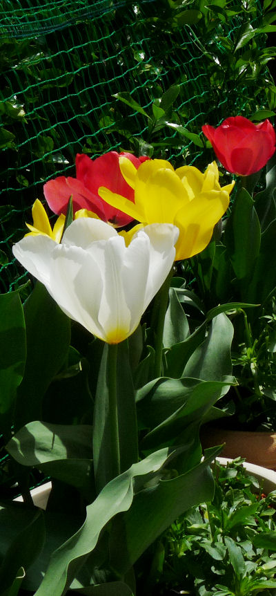 球根を掘り出したときは品種ごとにしておいたつもりですが、秋に植えるときにかなりいい加減になってしまい、今年のチューリップは一鉢にいろいろな品種が咲くという反省点もあります。また去年まで珍しい品種だった紫色の花がかなり丈夫で、普通の赤、白、黄色のチューリップより花期が長いのには感心しました。でも紫は地味ですね。今の品種は花も小さいし。そのうちでかい花の咲く品種が出てくる出しょうが。
