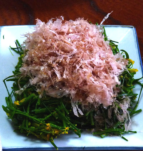 茹で時間は1分半〜2分。おかかと醤油をかけて、さらにマヨネーズをつけながら食べます。珍味なんだなこれが。サクサクとした歯ごたえと独特の香り。これだけでビール二本いけます。
